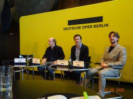 Die Veranstaltung verlief etwas ungewöhnlich. Da Aviel Cahn durch ein Verkehrsproblem das Opernhaus nicht mehr rechtzeitig erreichen konnte, nahm er per Video vom BER an dem Termin teil und stellte das Dirigententeam Michele Spotti und Maxime Pascal, und Titus Engel, der als Conductor in Residence das Team komplettiert im Foyer der Oper vor. Anwesend war die Kultursenatorin Sarah Wedl-Wilson.